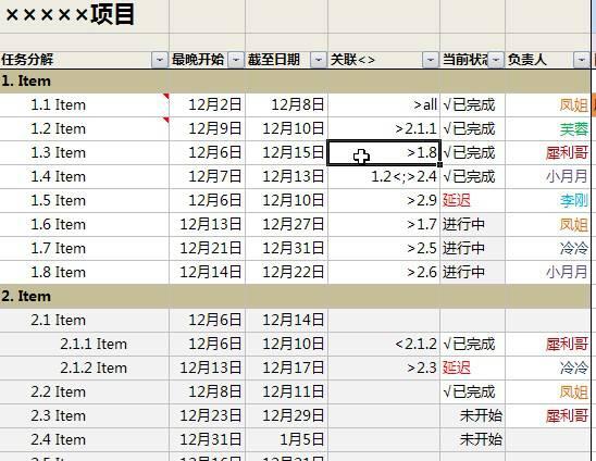 当犀利哥来找你说,我的任务的截止时间点我不能保证,我要延后2天,通过这个后置关联,你能够马上给犀利哥解释说,你的截止时间如果要后延,会导致你的后置任务即1.8无法如期开始,当我们在看1.8任务时,又会发现1.8若有延迟,会影响2.6无法正常开工……因此,若要中途调整项目任务,就需要将相关方叫到一起,评估调整的可行性——一切都要保证最终的关键里程碑。
