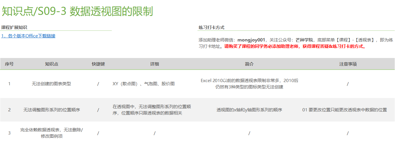 将透视表划分成10个部分来系统学习,如:软件基础操作(基本术语、重整布局、数据源、字段重命名、延迟布局更新等)、数据刷新、值字段的单元格格式、排序与筛选、透视表分组计算、透视表虚拟字段、透视表动态查询、透视表布局与样式、动态透视图。