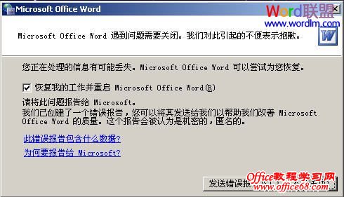 | 在日常办公中,Word是我们必需要用到的办公软件之一,无论是文章排版、制作书籍、编辑文档、流程图、管理文案等等,都必须要依靠Word来完成。但是,不是每次都会那么顺利的,有时候被病毒所侵害,或者一些不正常操作导致Word打不开出现一些异常现象也是难免会有的,这里Word联盟就来为办公爱好者们分享一些最常见的Word常见问题解决方案,希望能够快速帮到大家解决实际问题,不影响正常工作! 一、出现Word遇到问题需要关闭,如下图所示: