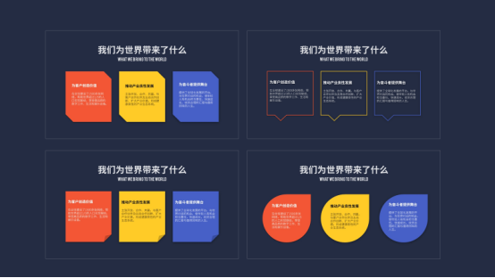 以上所示的PPT样式,适合平时的职场办公,如果是商务型或展示型PPT,还可以继续精简内容,同时在版式上做一些调整哦~