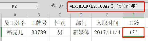最后,计算出年数后,我们用连接符 & 连接一个文本“年”,来得出如下结果: