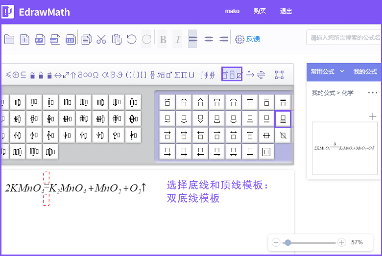 化学方程式是初中必考知识点,可以说前面基础的学习,会直接影响到学生对于化学这门学科的兴趣,也最终关系到升学考试的成绩。下面我们就以中学化学课高锰酸钾的分解为例,介绍一下如何在亿图公式编辑器制作化学方程式。