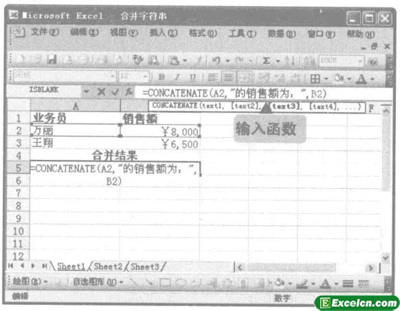 使用CONCATENATE函数合并excel文本字符串:如果要将多个文本字符串合并为一个文本,就需要使用CONCATENATE函数合并excel文本字符串。其语法结构为:CONCATENATE(text1.text2hellip;),其中,text1,text2,hellip;参数指定需要合并成一个文本的多个文本项,这些文本项既可以是文本字符串,也可