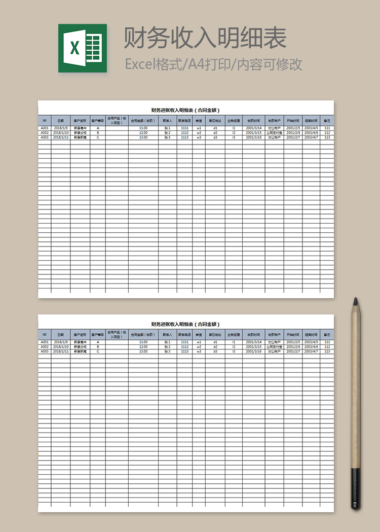 我拉网提供个性化财务进账收入明细表下载,模板编号为1881165,大小为11.75KB, 作品在2019-03-19上传到我拉网,作品高清大图模板,格式为xlsx, 属于仓储购销高清模板,作品模板源文件下载后可用编辑替换,模板中如有人物画像仅供参考禁止商用。