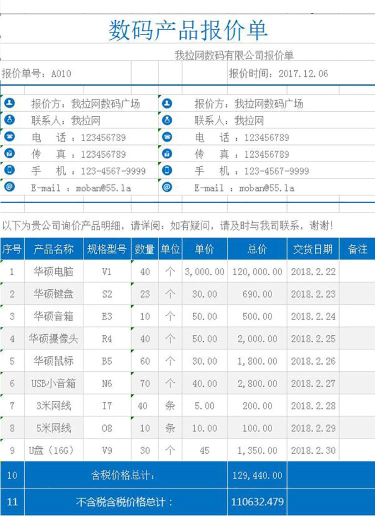 我拉网提供个性化数码产品报价单下载,模板编号为1904853,大小为158KB, 作品在2019-07-03上传到我拉网,作品高清大图模板,格式为xls, 属于财务会计高清模板,作品模板源文件下载后可用编辑替换,模板中如有人物画像仅供参考禁止商用。
