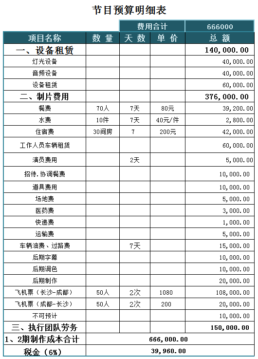 节目预算明细表excel模板