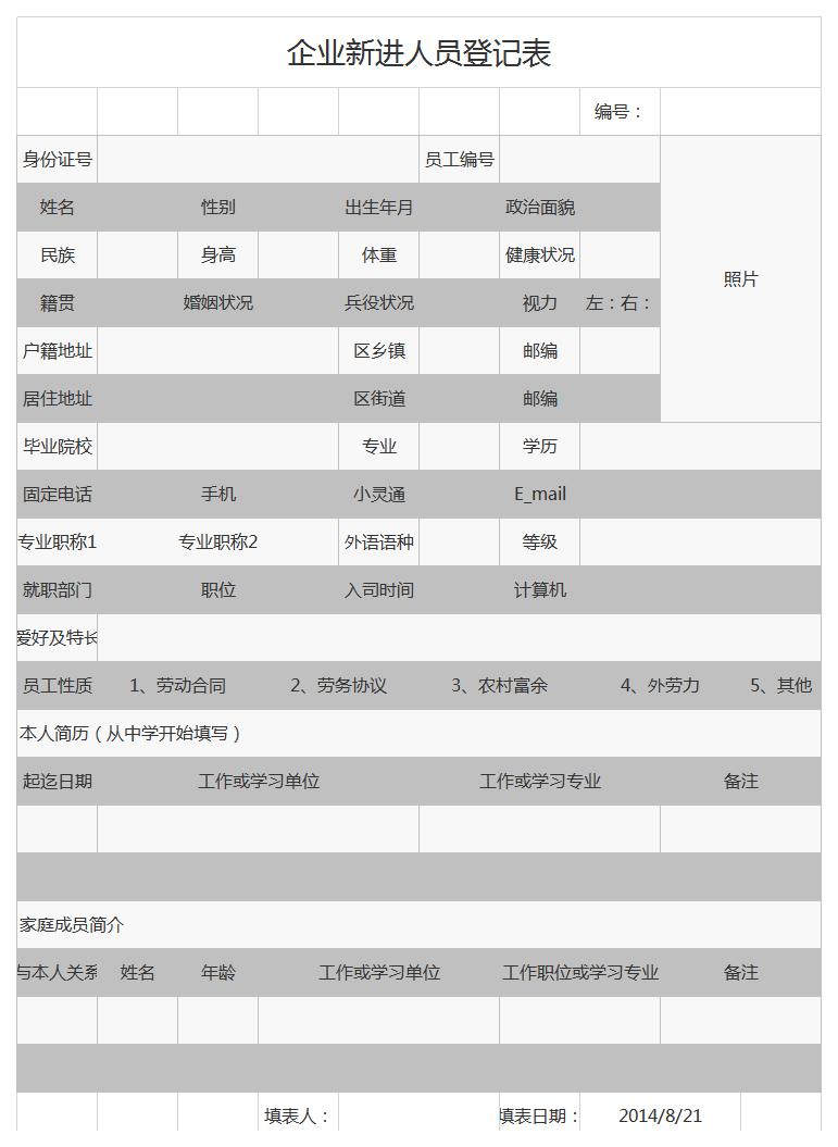 我拉网提供个性化企业新进人员登记表excel模板下载,模板编号为2089522,大小为18.5KB,