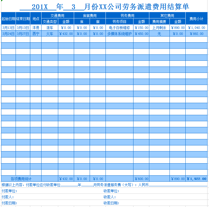 我拉网提供个性化公司劳务派遣费用结算单excel模板下载,模板编号为2092024,大小为,