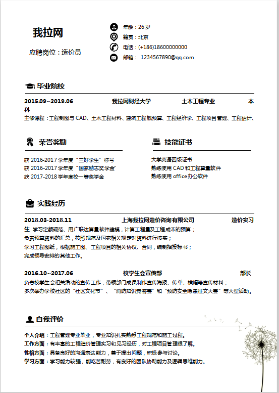 应届生造价员简约创意蓝黑色简历Word模板