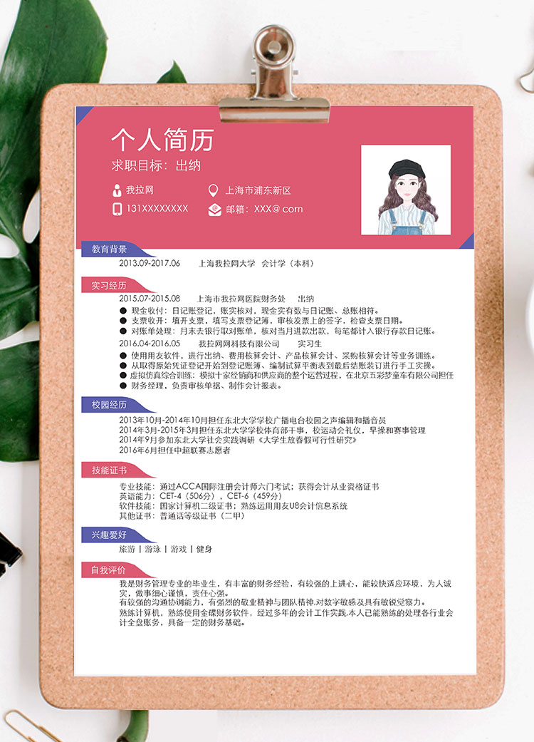 声明:桃红色精美财务出纳个人简历模板来自用户分享,仅限学习交流请勿用于商业用途。如损害你的权益请联系客服给予处理。