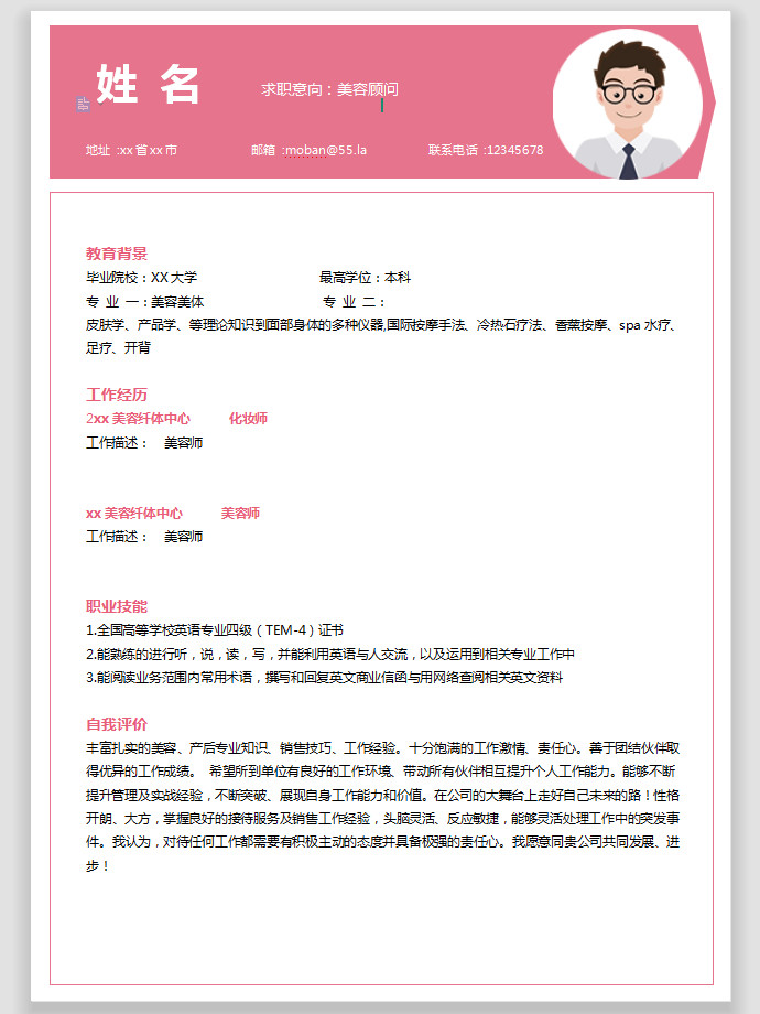 声明:美容顾问应届生简历来自用户分享,仅限学习交流请勿用于商业用途。如损害你的权益请联系客服给予处理。