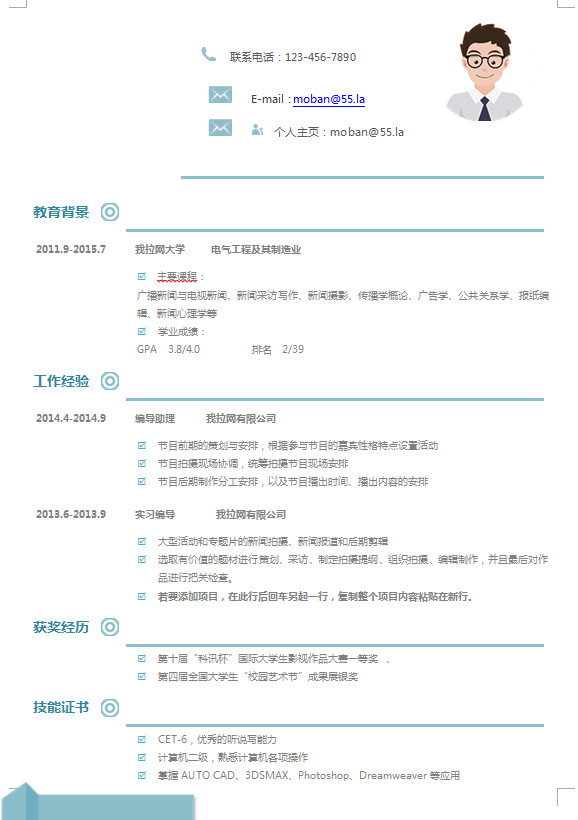 我拉网提供个性化实用简洁蓝制造业客服简历模板下载,模板编号为1892707,大小为68.4KB,