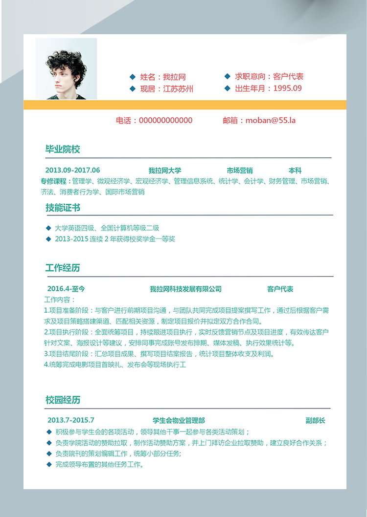 我拉网提供个性化湖蓝色极简风客户代表简历模板下载,模板编号为1911449,大小为155.65KB, 作品在2019-08-21上传到我拉网,作品高清大图模板,格式为docx, 属于销售简历模板高清模板,作品模板源文件下载后可用编辑替换,模板中如有人物画像仅供参考禁止商用。