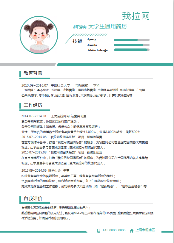 我拉网提供个性化简约大学生通用简历模板Word模板下载,模板编号为2079808,大小为121.76KB,