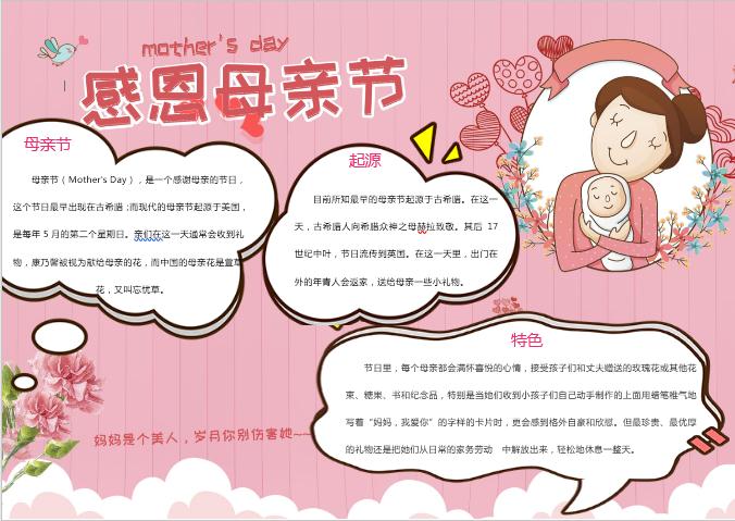 我拉网提供个性化粉色简约感恩母亲节手抄报小报下载,模板编号为1891178,大小为494.04KB,