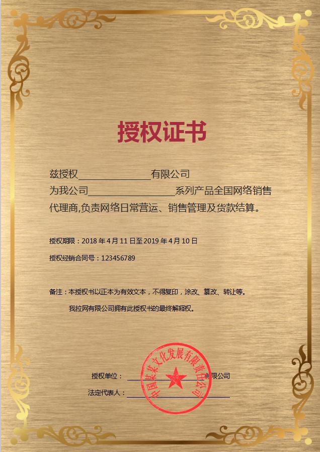 我拉网提供个性化简约金色大气授权证书Word模板下载,模板编号为1905911,大小为5.93MB,