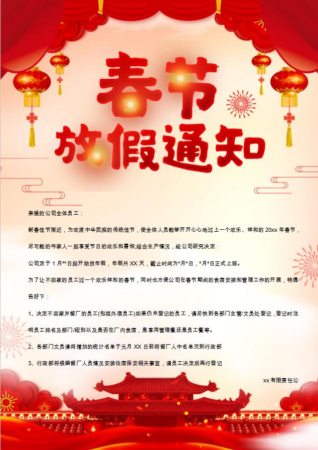 属于喜庆春节放假通知海报Word模板高清模板,作品模板源文件下载后可用编辑替换,模板中如有人物画像仅供参考禁止商用。