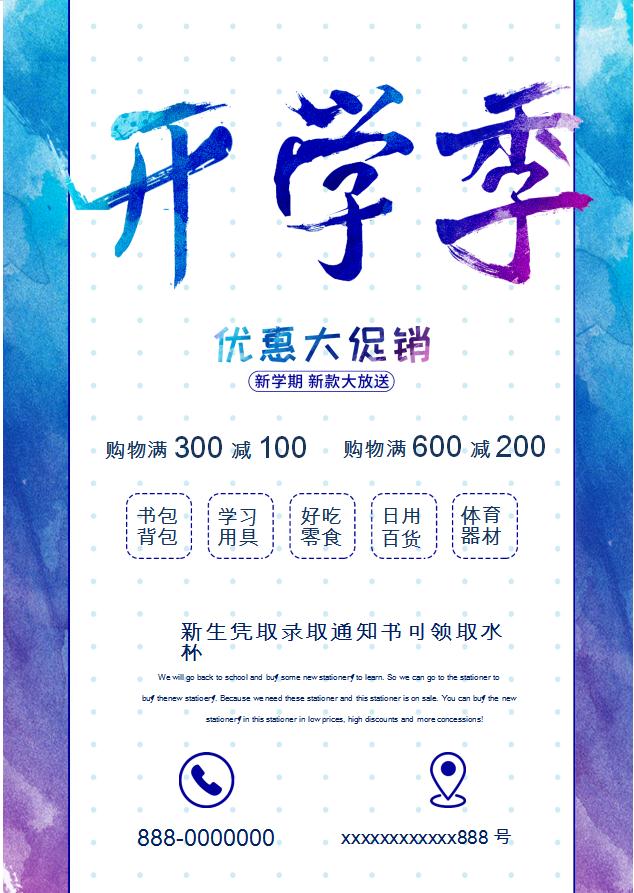 我拉网提供个性化蓝色水墨风开学季优惠促销WORD模板下载,模板编号为1906436,大小为3.84MB,