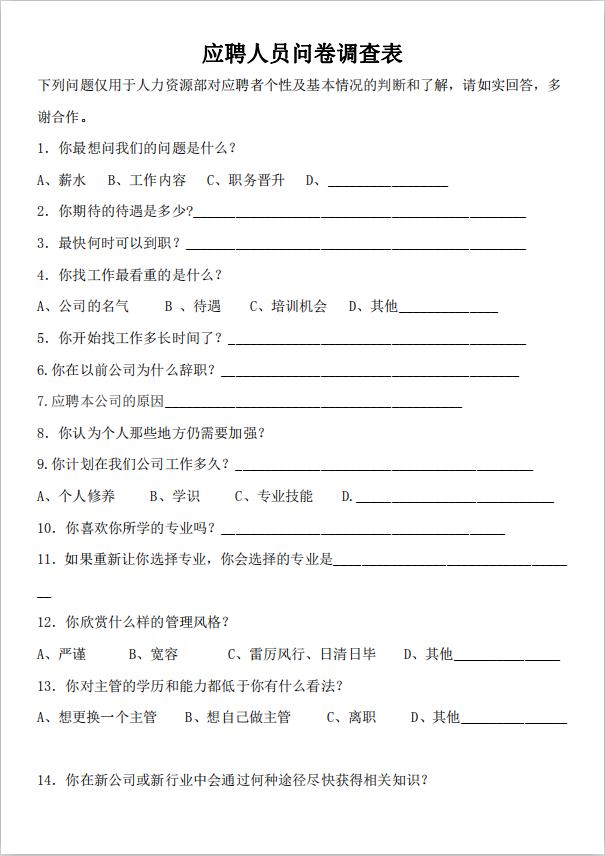 我拉网提供个性化应聘人员问卷调查表word模板下载,模板编号为1910804,大小为17.01KB,