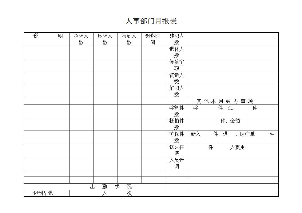 声明:人事部门月报表word模板来自用户分享,仅限学习交流请勿用于商业用途。如损害你的权益请联系客服给予处理。